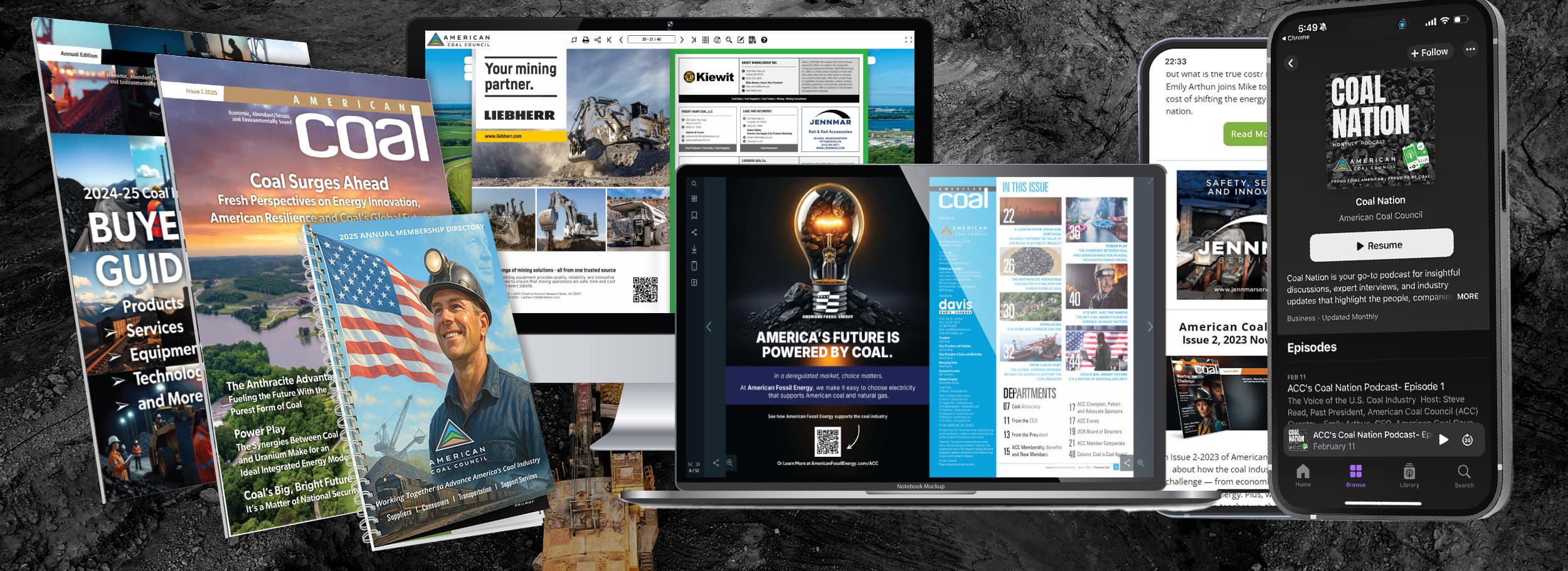 Since 2017, the American Coal Council (ACC) has partnered with The Davis Media Company Inc. to deliver a complete suite of print, digital, and multimedia platforms designed to keep the coal industry informed, connected, and engaged. Through American Coal magazine, the Annual Buyers’ Guide, Membership Directory, Industry Update e-newsletter, Coal Nation podcast, and AmericanCoalCouncil.org, advertisers can reach top decision-makers across the entire coal value chain — from producers and suppliers to consumers, transporters, and service providers.